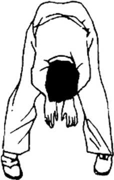 身体猛然前倾,双臂夹住两耳,直臂 向下。过两脚、穿挡向后运动,上身伸直, 尽量拉长、直到双手不能再向后伸时停 止。如(图58)所示。