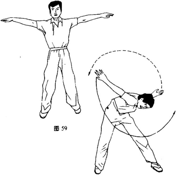 双脚分开站立、脚间距约为肩宽的两倍,两手侧平举,掌 心向下、昂头、挺胸收腹、目视正前方(图59)。身体向左侧前 俯,双臂伸直旋内,掌心向后,如(图60)所示。