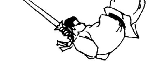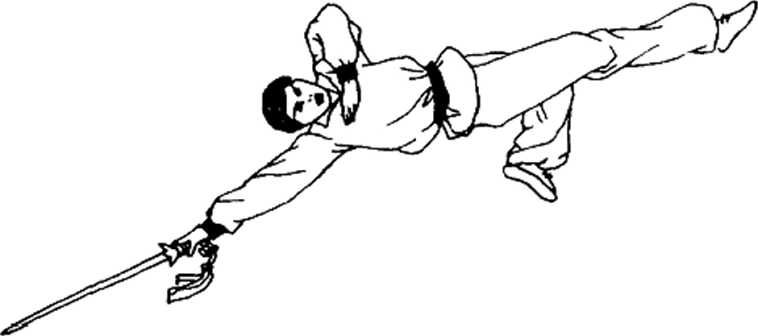 落于体左外后侧,剑指朝前,体微后仰,目视前方。