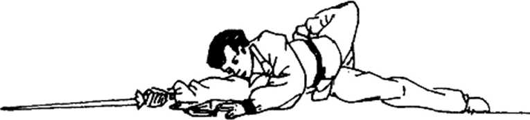 演练者身体向左滚,翻身,左手由体右侧向左反背挥出, 左脚向前蹬直,右手持剑由前向后平移,剑尖朝右上外侧,体 平躺、双腿伸直并拢,目微闭(图2-124)。