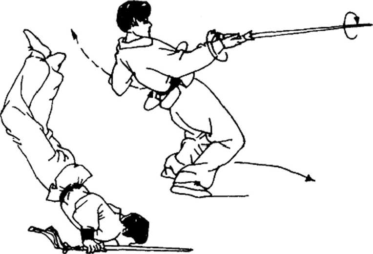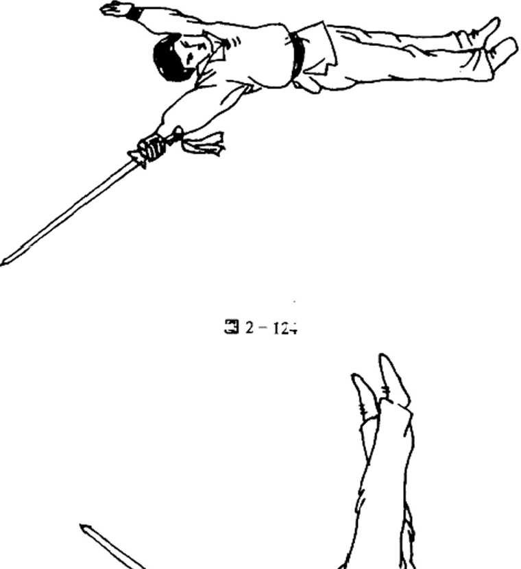 身体继续上顶,右手转腕,使剑向前平放地上,两手同时 用力撑地,头从双手中穿过,然后双手弯屈,挺胸,挺腹,双腿 后倒,头使劲前抬,身体呈反弓形下落(图2-126)。