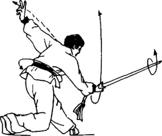 左脚向右前进一步,脚尖外摆45度,重心下降,右膝前跪 于左膝弯后方,脚尖点地,微拔根,同时右手持剑,手腕由上向 下,向右,再向上绕一周,剑尖随之于空中划出一小圈,然后体 右后微转,右手腕下沉,手背向下,剑尖斜向前上方,左手向左 后侧外摆,反手伸臂,坐腕,剑指朝上,目视剑身(图2- 128)。