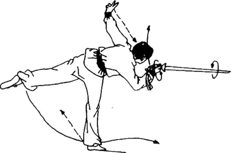 上动不停,上身向左拧转,髓向左前上顶,体微右后仰,右 手持剑向前,向上撩出,左手向左后上方后挥并架隔,横腕架 191