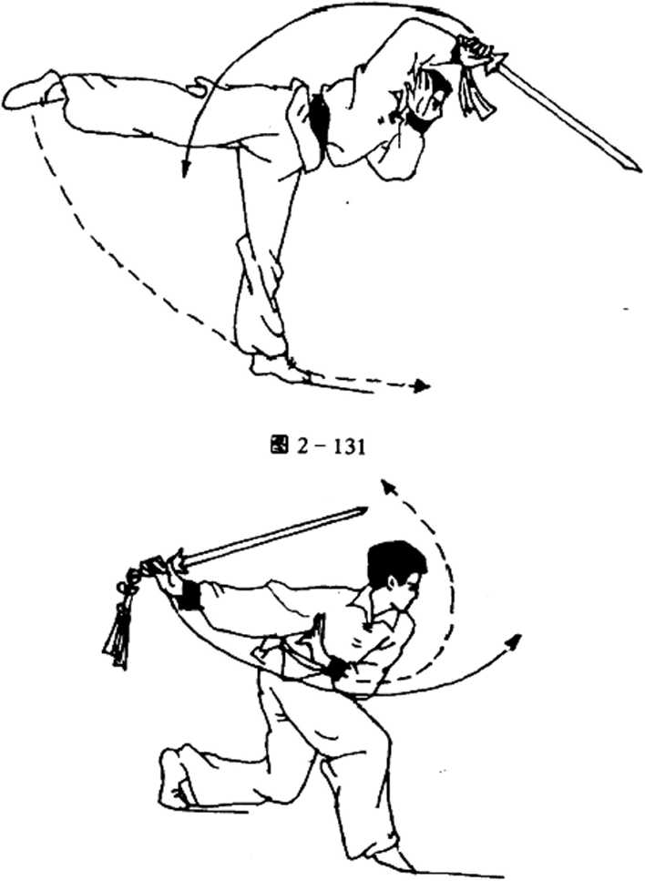 右脚向左前进落地(图2-132),重心随之前移,右手持 剑,以肩为轴,向上,向后,再向下准备撩剑,目斜视前方。