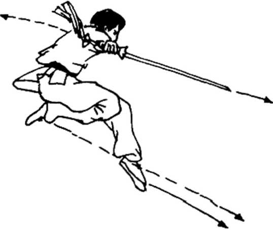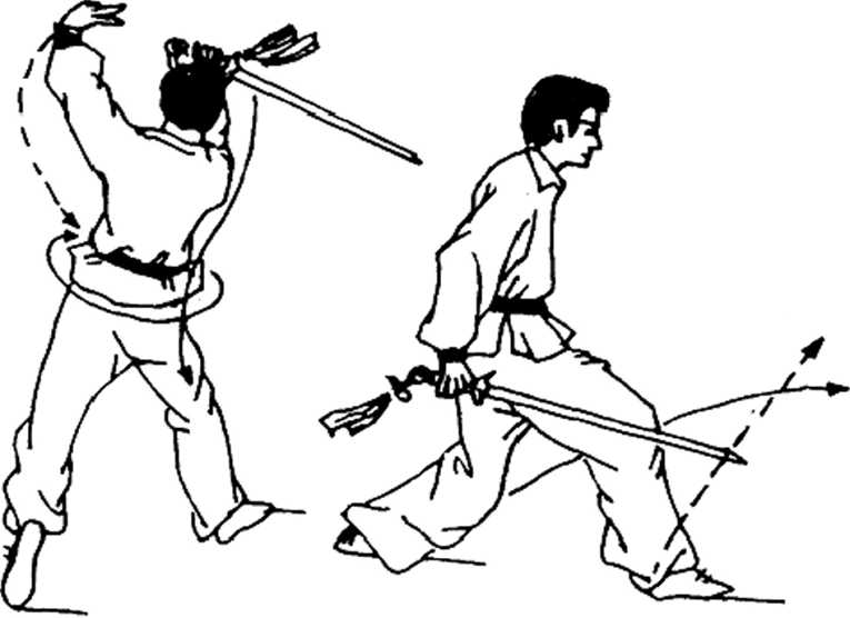 如图2-135所示,重心前移,左脚向前上迈出,然后右脚 猛登离地面,屈腿于臀后,右手屈臂上提,准备向前刺剑,目视 前下方。