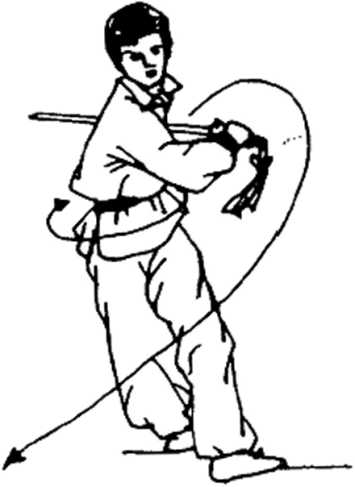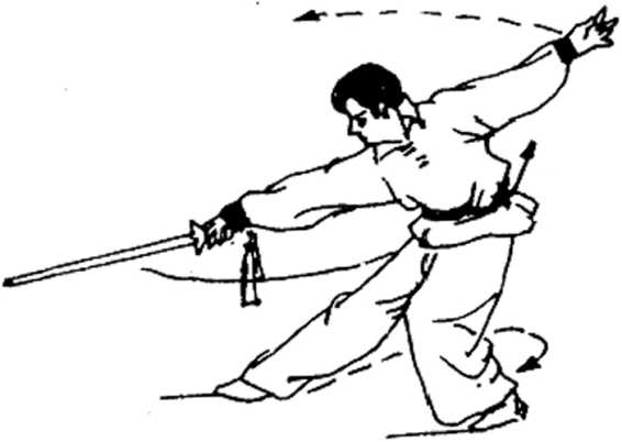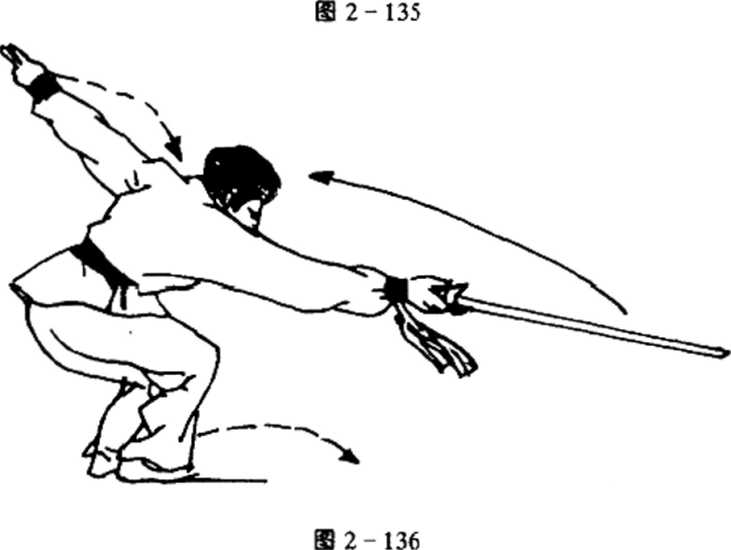 演练者体右后转,重心后移于左脚,同时右手握剑,小臂 旋内后拉至右腿外侧,虎口朝前,剑尖前指,左手随体转下落 至左腿外侧,坐腕,手心向下,剑指向前,目视前方(图2- 134)。